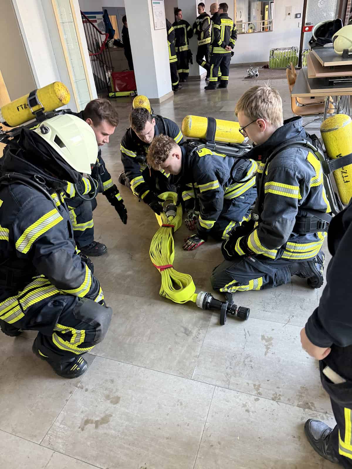 Am vergangenen Samstag übten trotz frostiger Temperaturen im Rahmen der jährlichen Fortbildung für Atemschutzgeräteträger insgesamt 15 Feuerwehrleute aus fast allen Ortsfeuerwehren gemeinsam Standardmaßnahmen und -situationen in Brandeinsätzen unter Atemschutz. Dazu gehörte unter anderem das sogenannte Schlauchmanagement, also das Verlegen von Schläuchen in das Gebäude durch Treppenhäuser, Flure und in unterschiedliche Räume, so dass nicht plötzlich der Schlauch zu kurz ist oder sich verklemmt. Passiert das, kann es zu unnötigen Verzögerungen bei der Brandbekämpfung kommen oder sogar gefährlichen Situationen. Eine andere Standardmaßnahme ist die Öffnung von Türen zu Räumen, in denen es brennt. Auch dabei kann es zu unangenehmen Situationen kommen, wenn das unbedacht oder ohne die nötige Vorbereitung passiert. Eine plötzliche Rauchgasdurchzündung oder -explosion ist möglich, mit entsprechenden Folgen und Gefahren. Vor dem praktischen Teil wurden in zwei kurzen theoretischen Impulsen die Funksystematik und die Atemschutzüberwachung sowie die nötige Einsatzstellenhygiene nach einem Einsatz besprochen, um gut vorbereitet in den praktischen Teil zu starten.