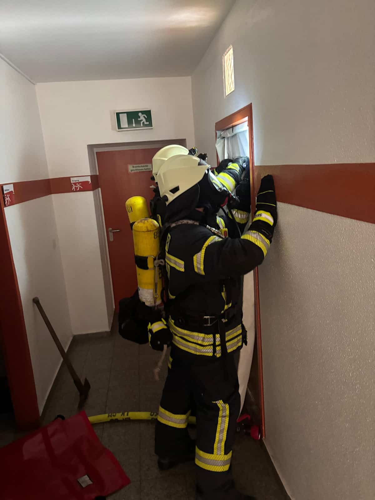 „Sind am Brandraum im 1. OG angekommen, die Tür ist heiß, niedrigster Druck ist 260 bar, wir gehen rein“ kommt es aus dem Funkgerät, das der Feuerwehrmann mit der Weste mit der Aufschrift „Atemschutzüberwachung“ trägt. Er notiert die Uhrzeit für den Trupp 1 auf einer Überwachungstafel und berechnet die ungefähre Einsatzdauer und den Restdruck für Rückzug des Atemschutztrupps aus dem Gebäude. Dieser Kamerad ist die Lebensversicherung und der doppelte Boden für die beiden Feuerwehrleute, die jetzt unter Atemschutz versuchen, den Zimmer- oder Wohnungsbrand hinter der Tür in dem Gebäude zu löschen. Er passt auf, dass sie nicht zu lange im Gefahrenbereich bleiben, erinnert sie, wann sie den Rückzug antreten sollten, und ist derjenige, der weiß, wo sie ungefähr in einem Brandobjekt sind, sollte etwas Unvorhergesehenes passieren.