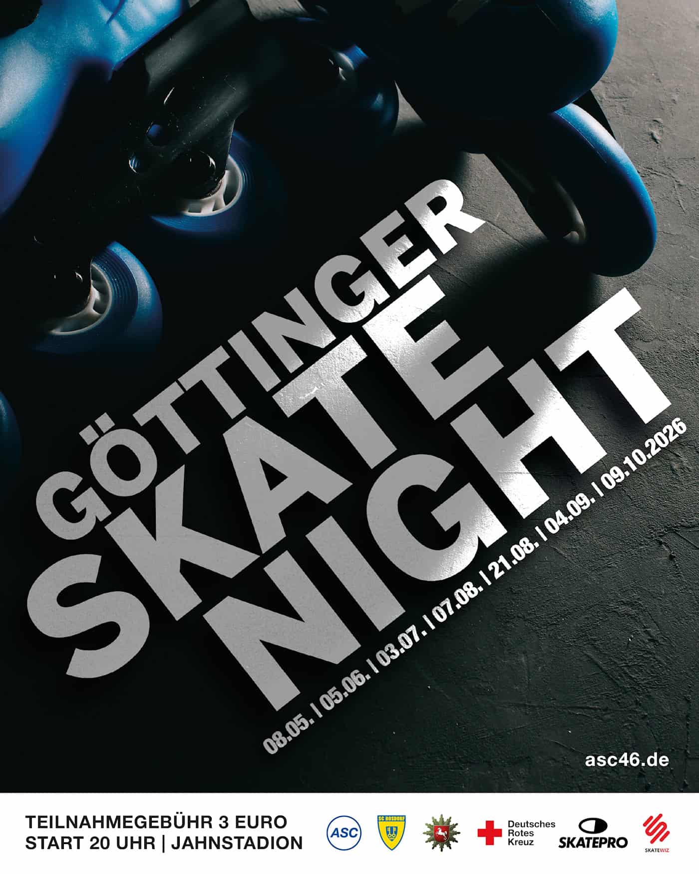 Göttingen, April 2026 ● Nach der Winterpause startet die Göttinger Skate Night am 8. Mai in die neue Saison. Gemeinsam mit dem SC Rosdorf lädt der ASC Göttingen zu einer rund 13 Kilometer langen Runde durch das Stadtgebiet ein. Ein besonderes Highlight: Unter allen Mitfahrenden wird ein Startplatz für den Göttingen HALBMARATHON am 10. Mai verlost. Treffpunkt ist der Parkplatz am Jahnstadion (Sandweg 7). Der Abend beginnt um 19:00 Uhr mit dem Ankommen und Einfahren. Der Ticketverkauf findet zwischen 19:30 und 20:00 Uhr statt (3 Euro, Barzahlung vor Ort). Um 20:00 Uhr erfolgt eine kurze Einführung, bevor die gemeinsame Tour um 20:05 Uhr startet. Die Rückkehr ist gegen 21:30 Uhr vorgesehen.